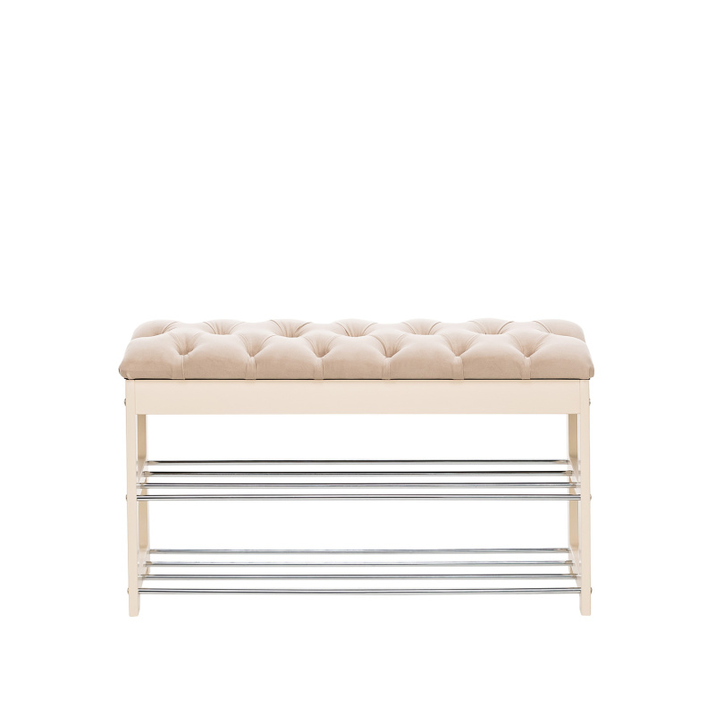 Широкая двухместная банкетка с мягким сиденьем и полкой для обуви. Она сделана в незамысловатом дизайне и органично впишется в любой интерьер.