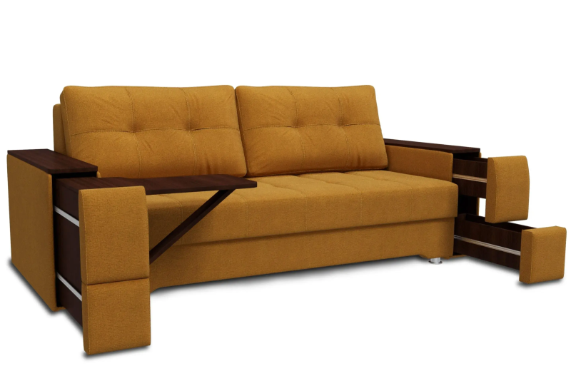 - Функциональные подлокотники: Один подлокотник оснащён выдвижным ящиком для хранения, а второй — удобным встроенным столиком. Это делает диван максимально практичным.