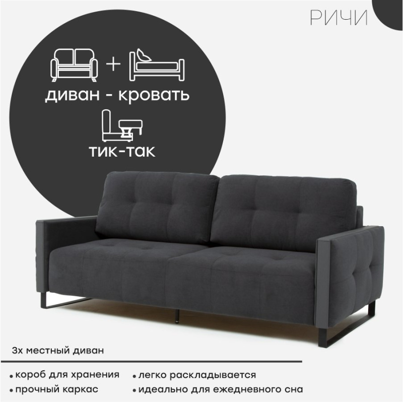 «Ричи» - идеальный диван, вершина комфорта, эталон современного стиля. Декор на подлокотниках подчеркивает стиль дивана и служит подставкой для посуды или гаджетов. Под посадочным местом расположена просторная ниша для хранения. Эстетичная задняя спинка позволит использовать диван для разделения жилого пространства. А пристенная планка сделает Ваш сон комфортным. Элегантные металлические опоры делают диван легкими воздушным. Диван имеет просторное спальное место с ортопедически-правильным наполнением на надежном металлокаркасе, которое обеспечит здоровый сон и наивысший комфорт посадки.