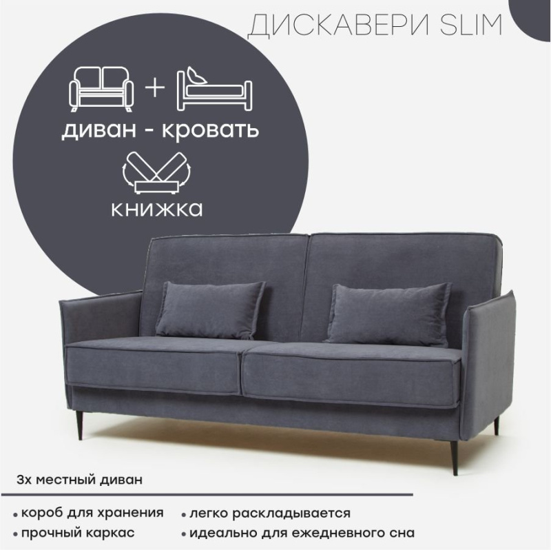 "Дискавери SLIM" - элегантный, компактный диван в стиле LOFT. Несмотря на небольшие размеры, диван имеет полноценное спальное место с ортопедически правильным наполнением, а также просторное место для хранения под посадочной частью. В комплект входят 2 мягкие подушки со стильным кантом. Диван выглядит отлично со всех сторон и может использоваться для разделения жилого пространства.