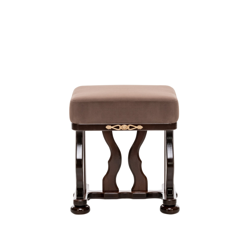 Банкетка с мягким сидением и изогнутыми опорами необычной формы выполнена из массива дерева. Сиденье обтянуто мебельной тканью высокого качества. Надежные опоры банкетки придают ей устойчивость. Банкетка станет отличным дополнением к туалетному столику «Джульетта».